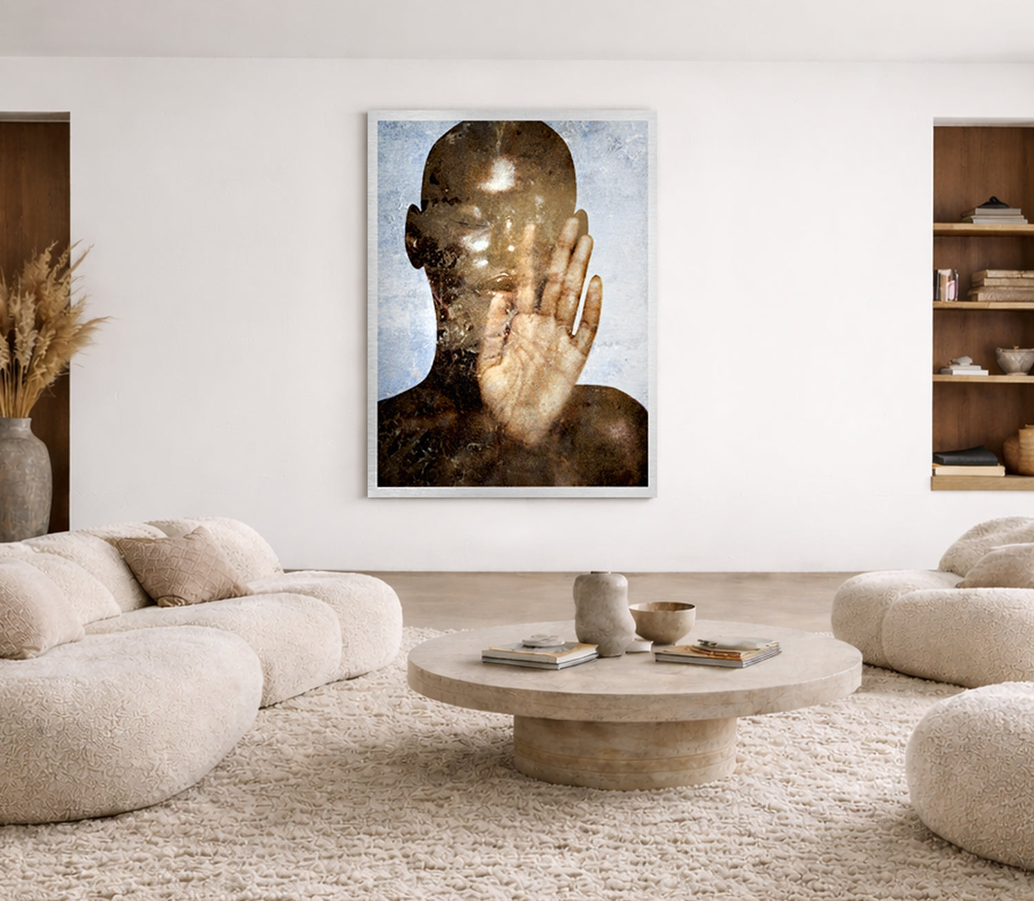Printed on silver metal, the textures hold light and shadow, creating a sense of depth, touch, and aspiration.