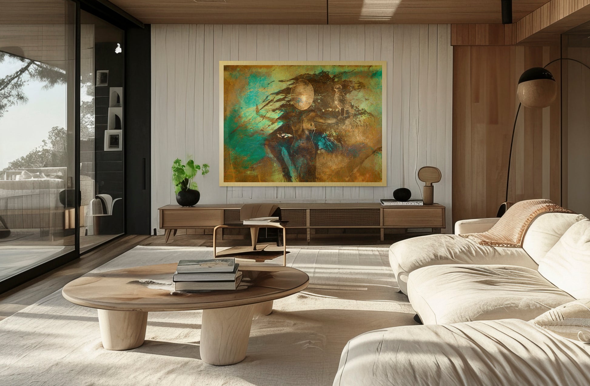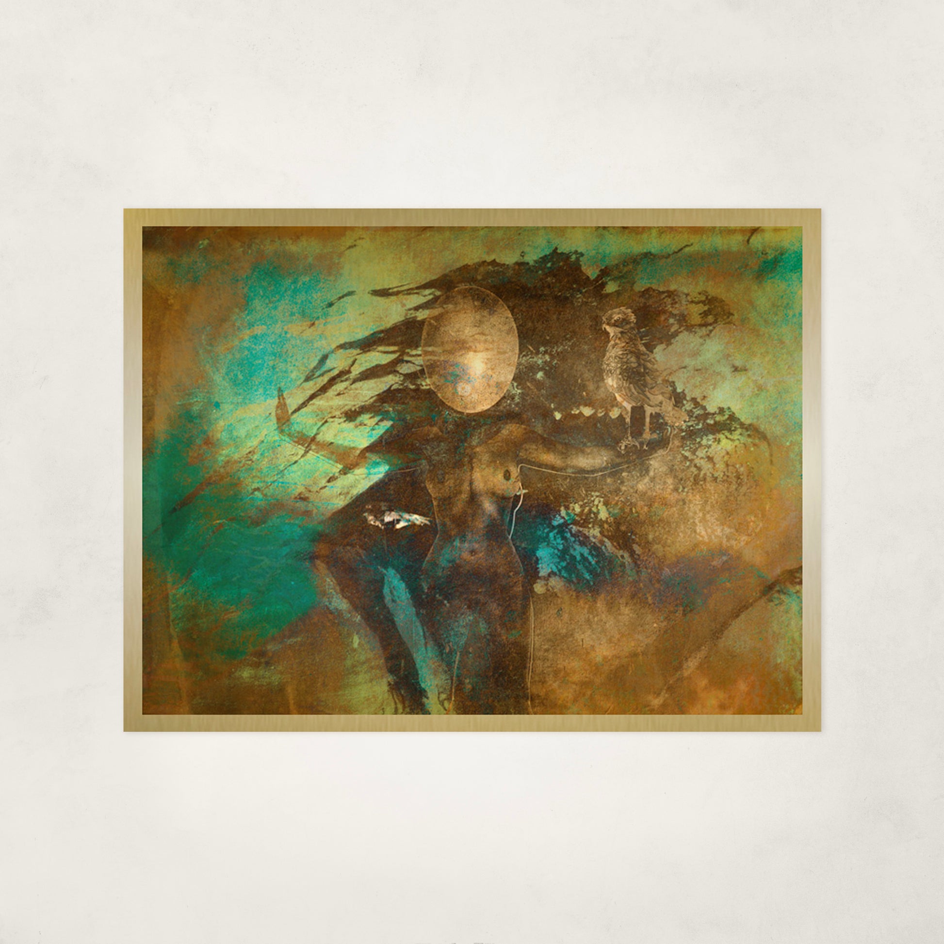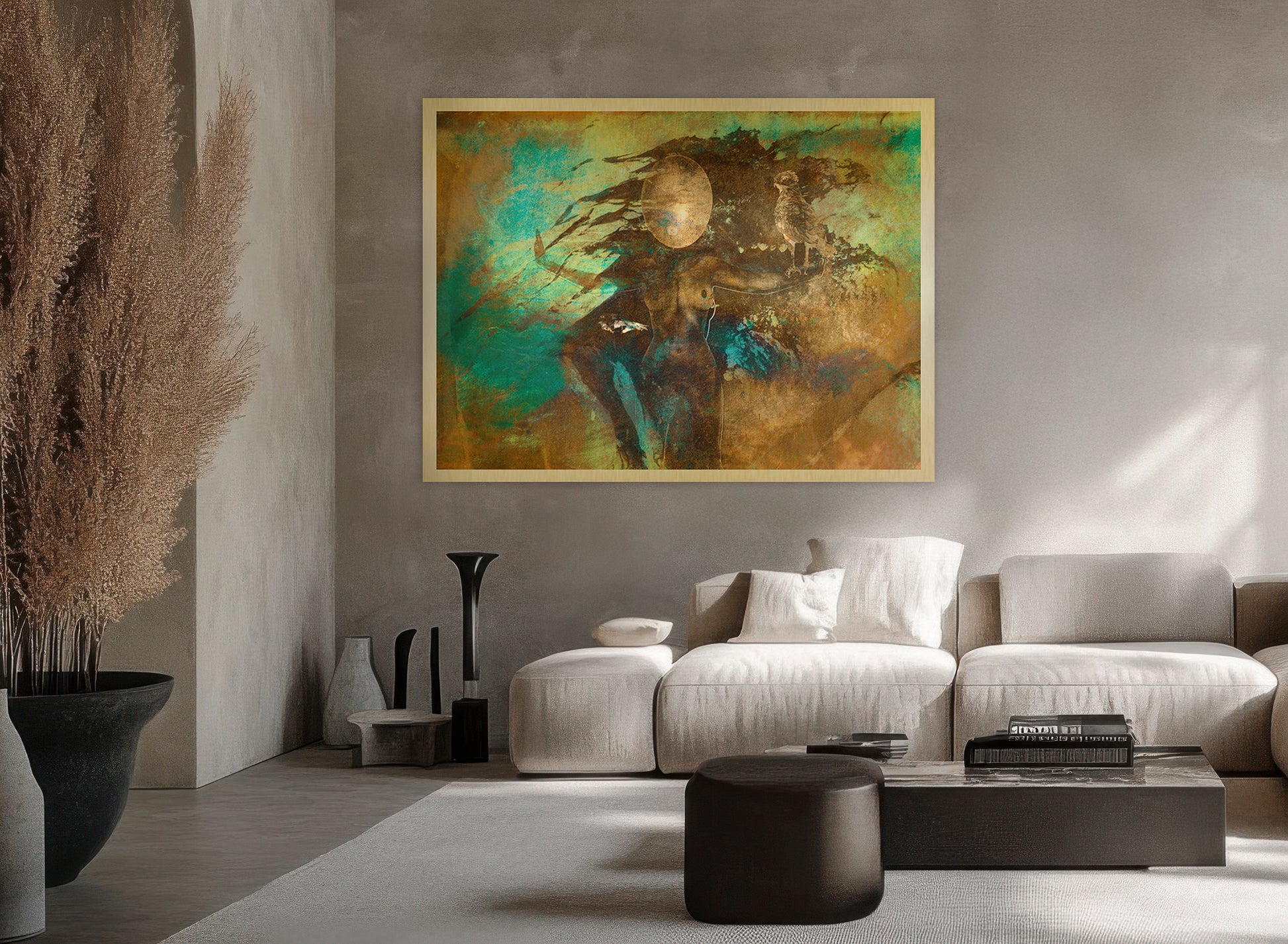 A concealed sub-frame is mounted on the back of the artwork, creating a floating effect approximately 20 mm from the wall.