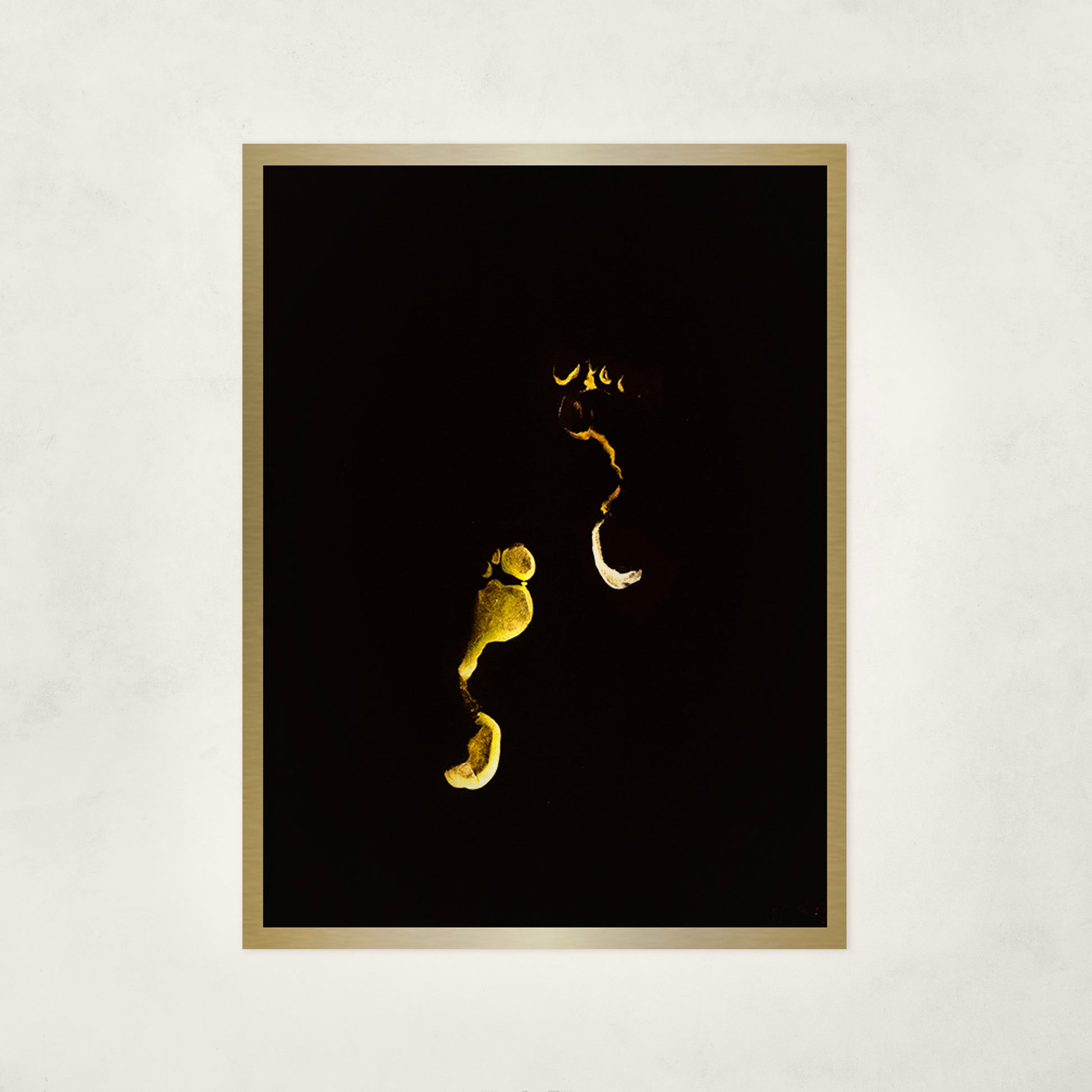 Printed on gold metal, the contrast between light and void sharpens the impact, giving the piece weight, focus, and quiet authority.