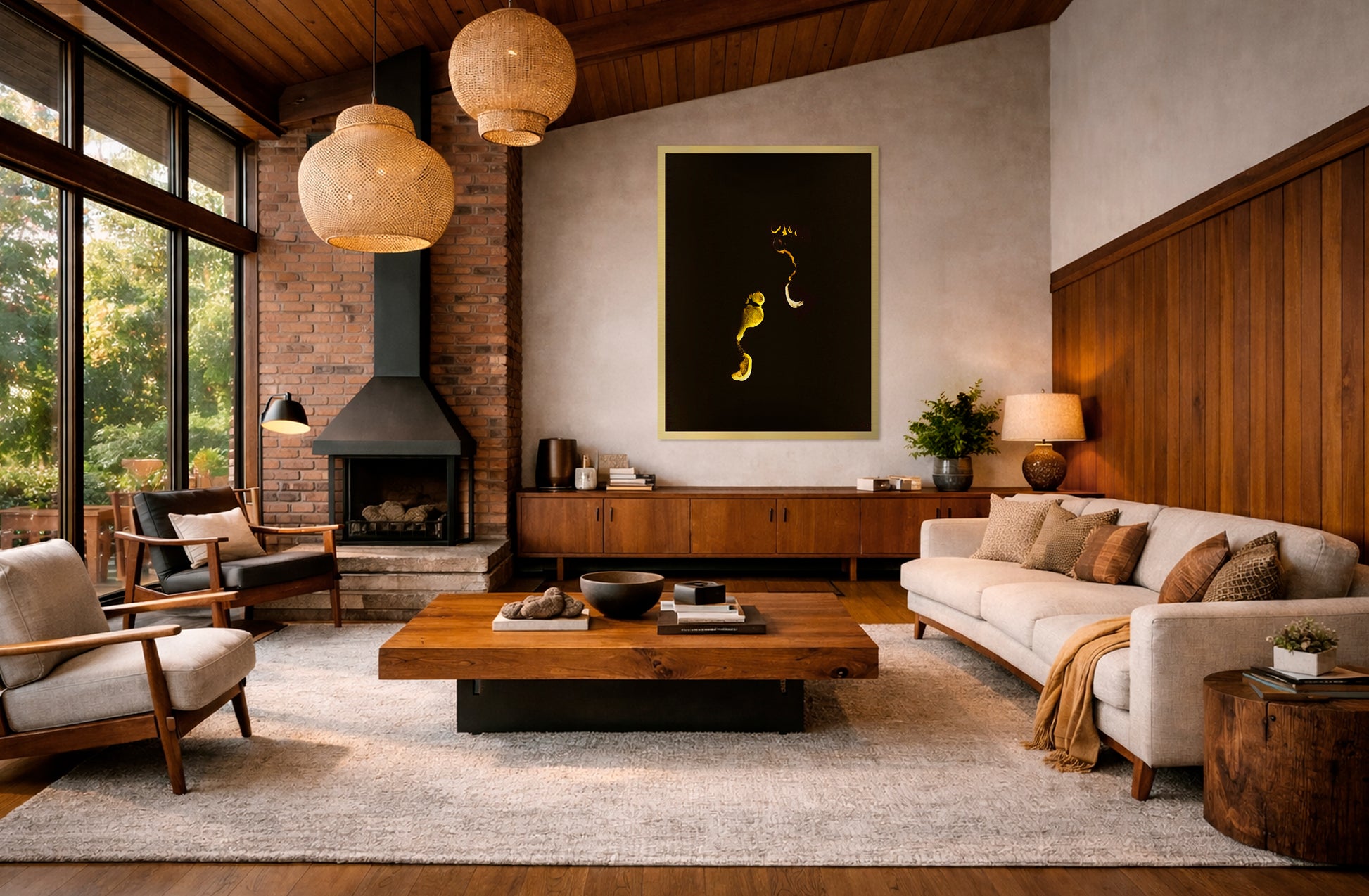 A concealed sub-frame is mounted on the back of the artwork, creating a floating effect approximately 20 mm from the wall.