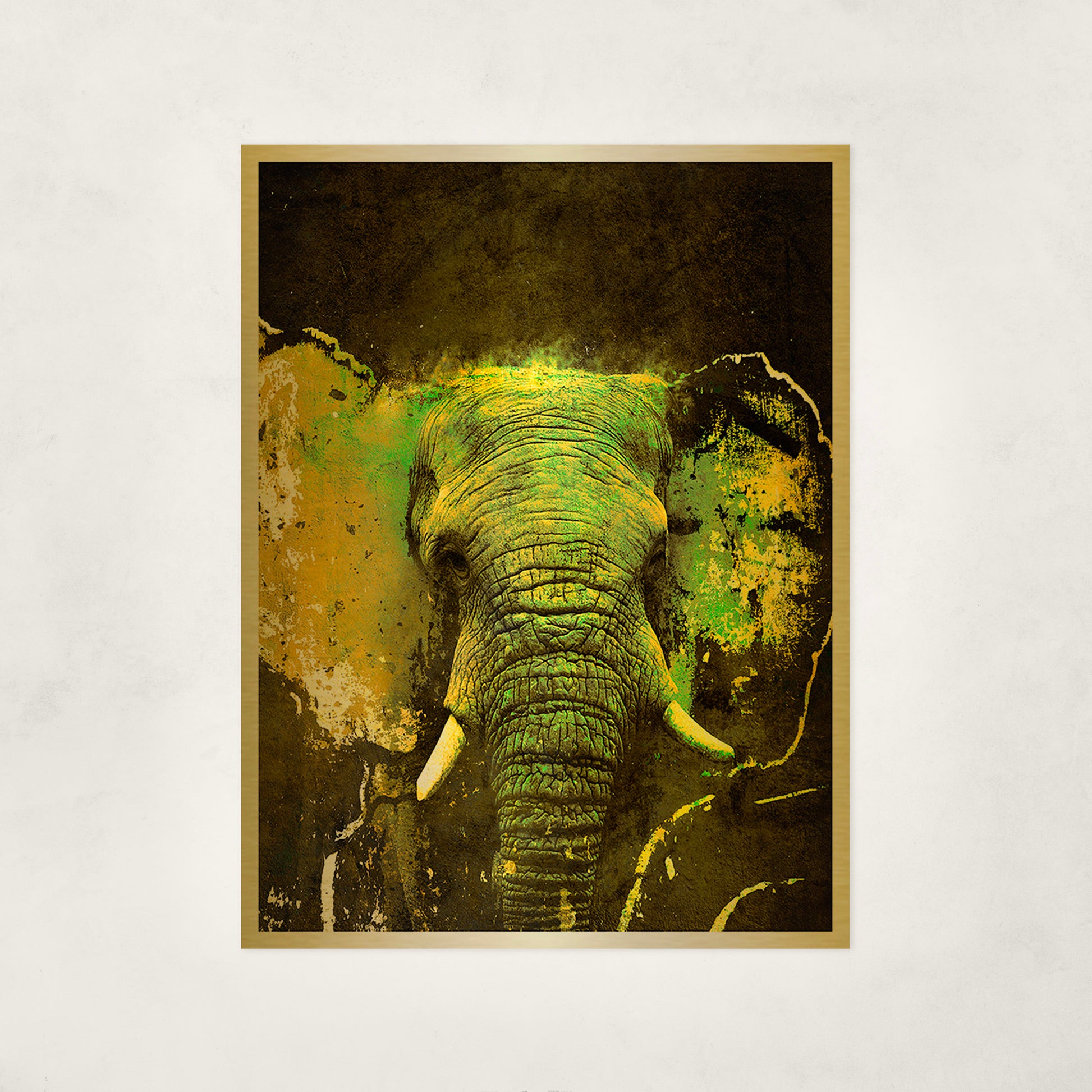 The layered greens and golds bring the elephant forward with depth and intensity — alive, confident, unwavering.