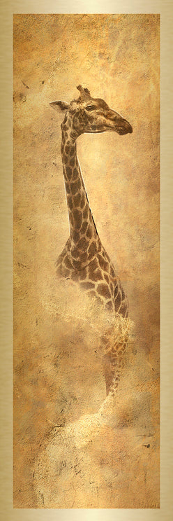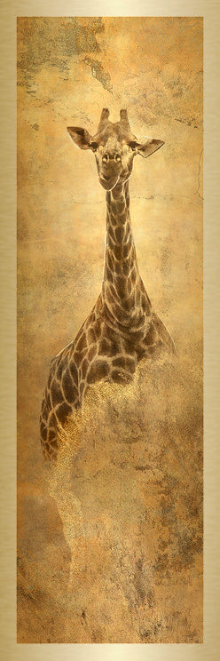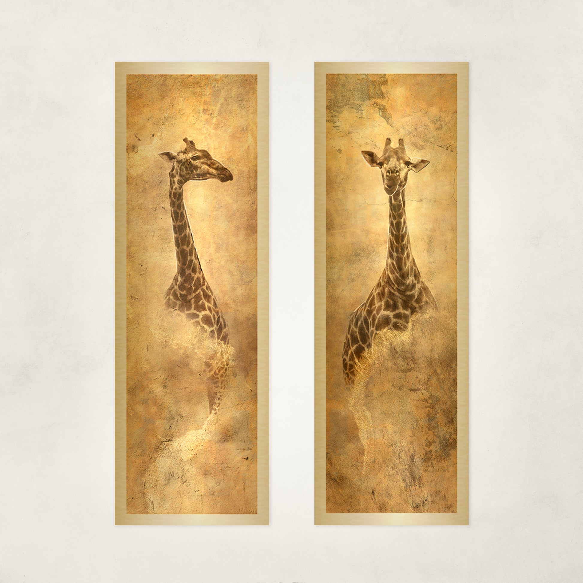 Printed as a pair on gold metal, the work gains presence and balance. The vertical forms frame a space with assurance, offering a steady sense of protection and clarity.